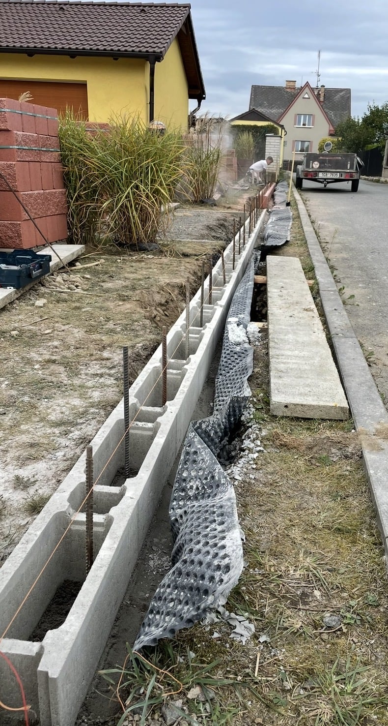 Opěrná zeď musí odolat dlouhodobému tlaku zeminy, vlhkosti i mrazu. Proto je technické řešení klíčové – a my ho nikdy nepodceňujeme. Zajistíme: